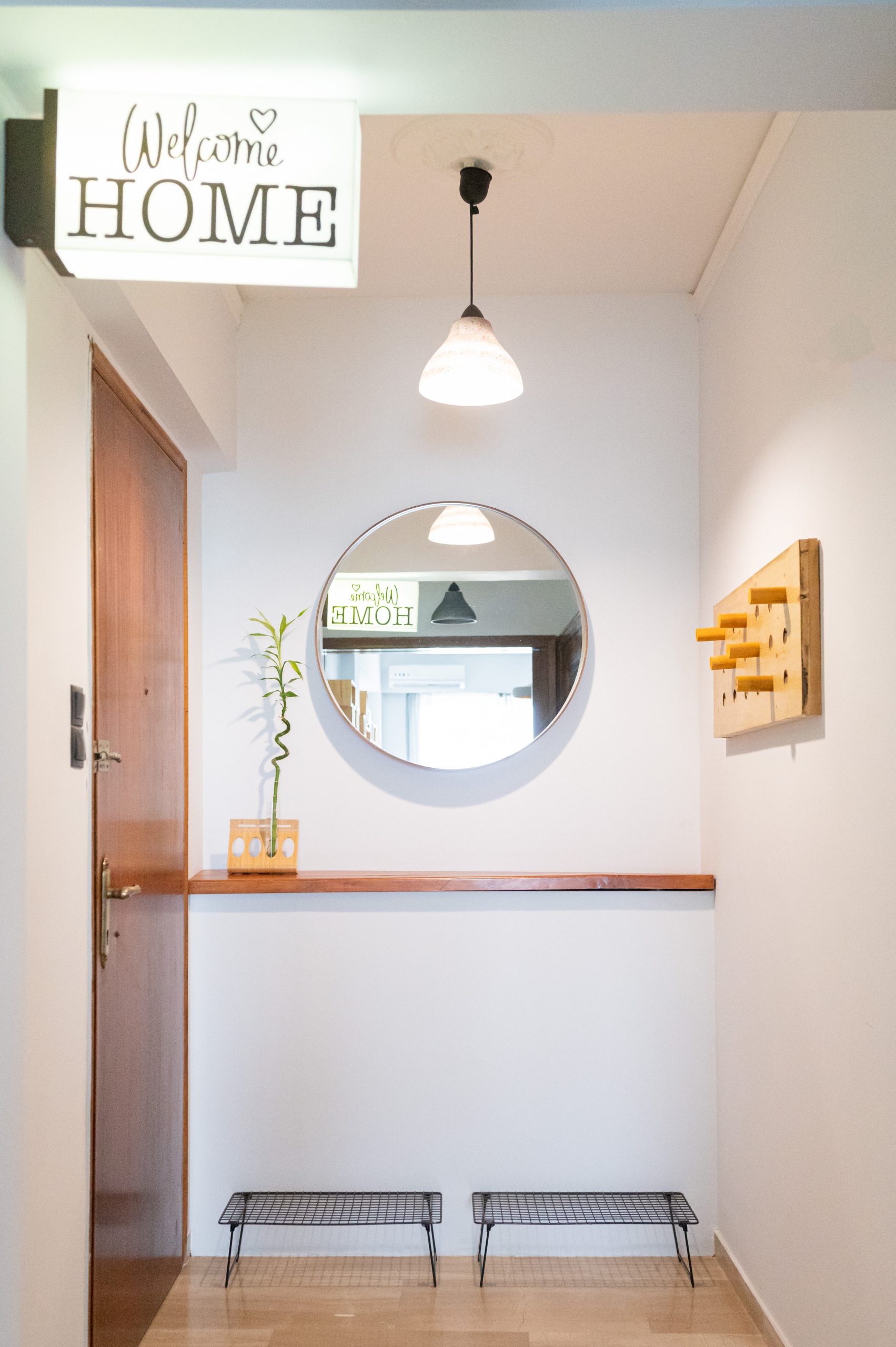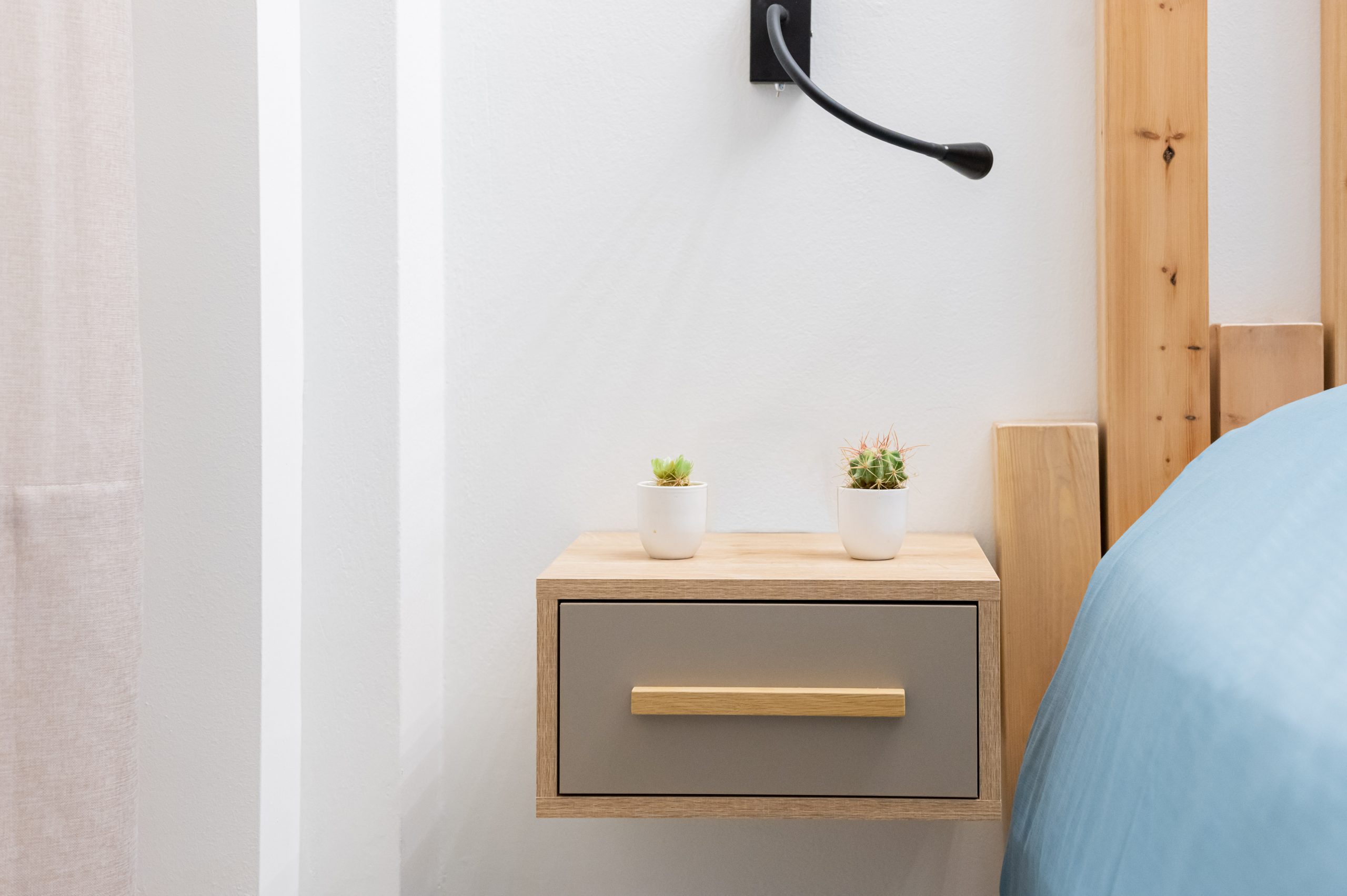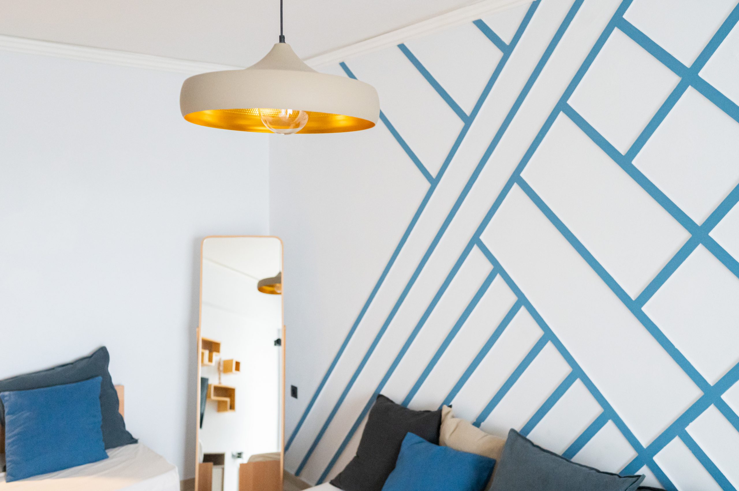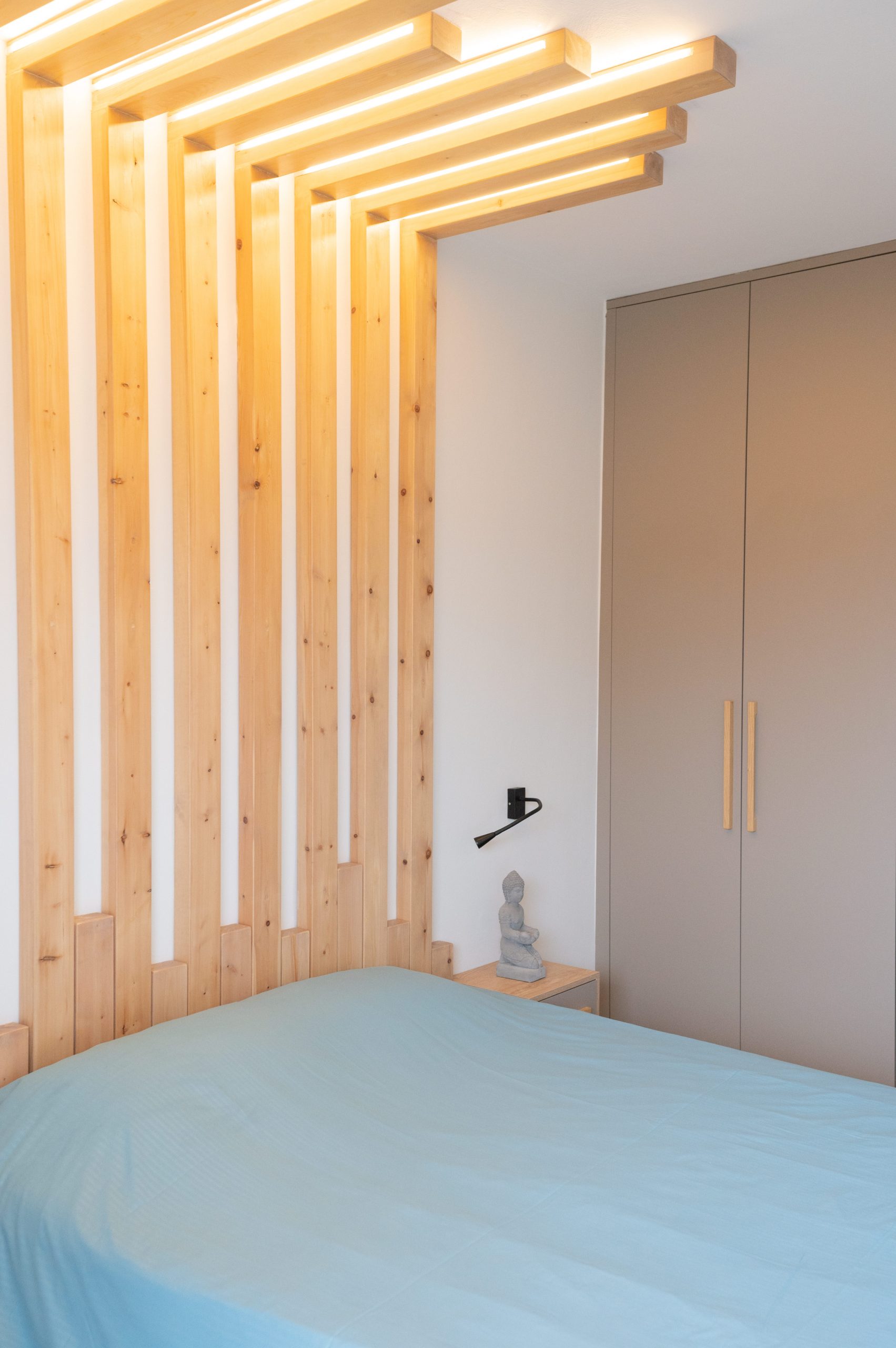 The geometric shapes with colours on the wall, combined with scattered details in the space from wood in natural colour, the polymorphic construction with points and the linear lighting give a direct, vivid and imaginative illustration in the apartment.